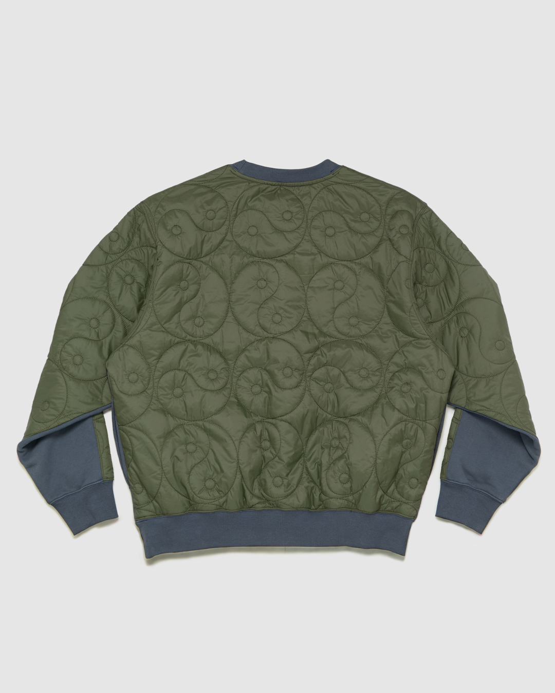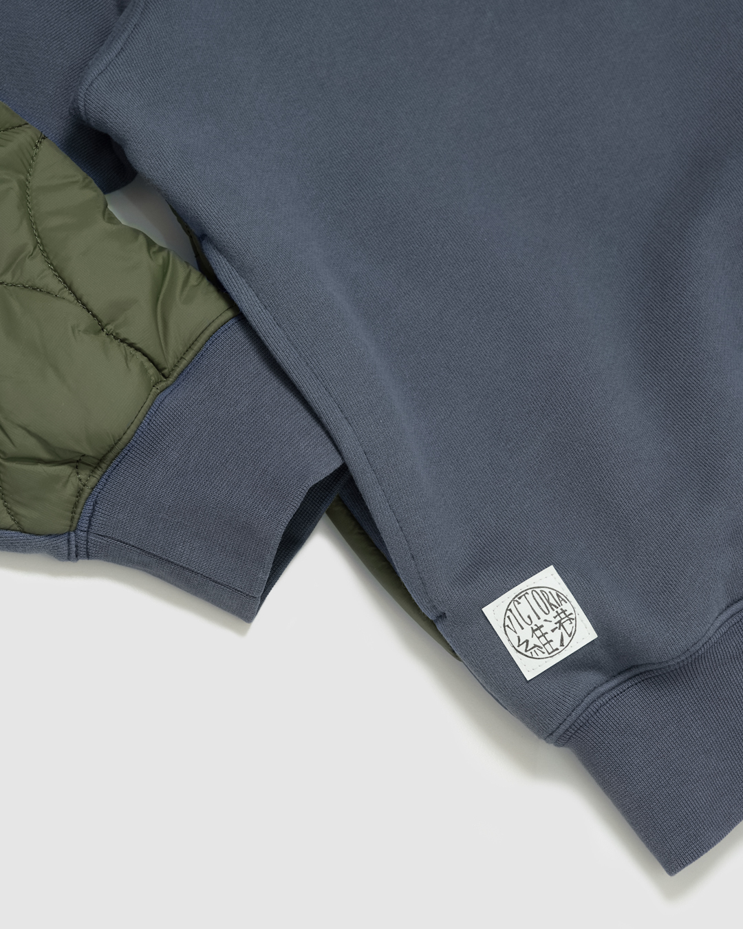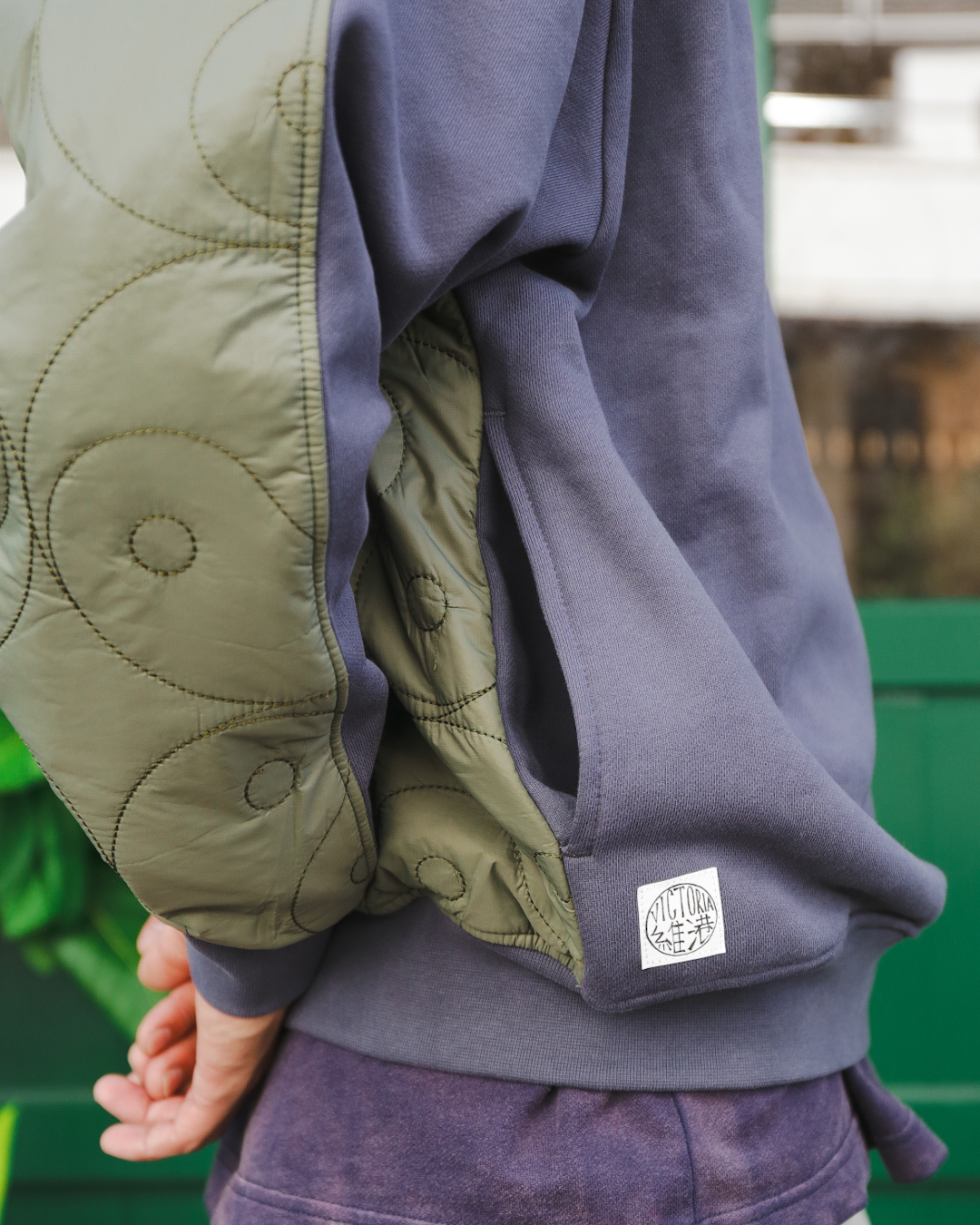 フロントはタフなスウェット地、バックは薄手のキルティングの目を引く切り替え