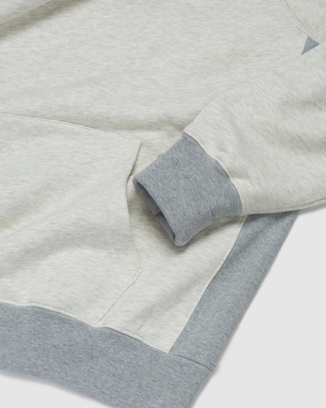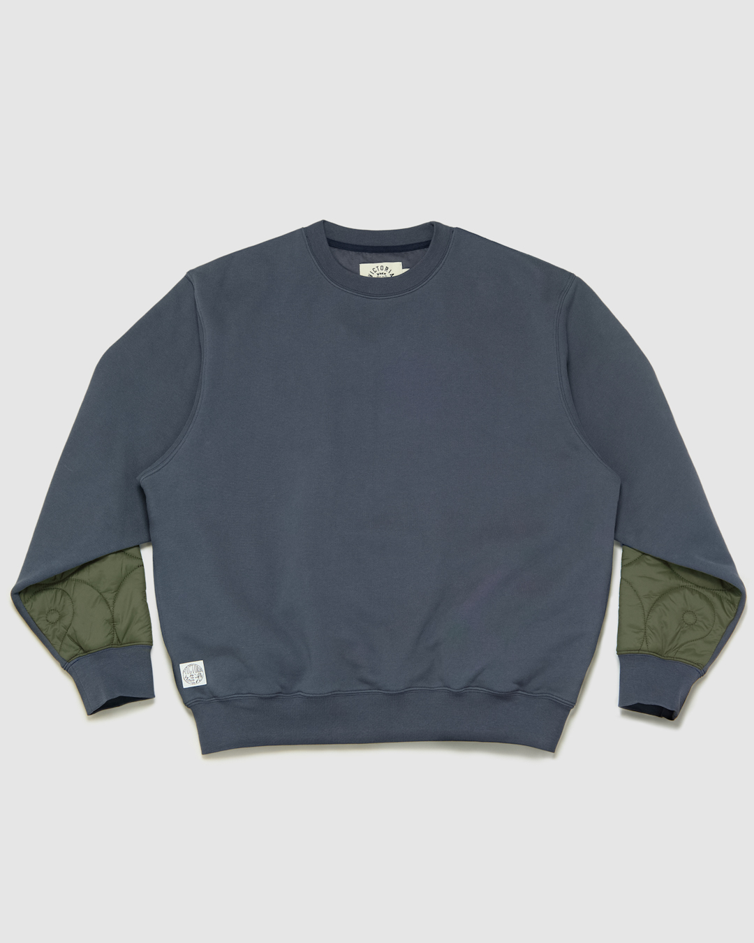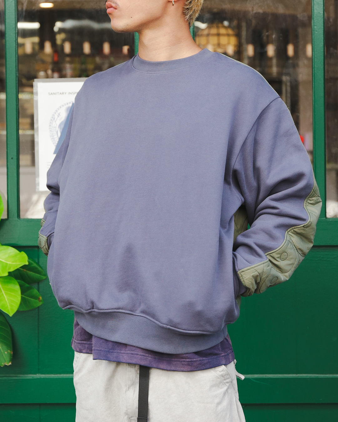 フロントはタフなスウェット地、バックは薄手のキルティングの目を引く切り替え