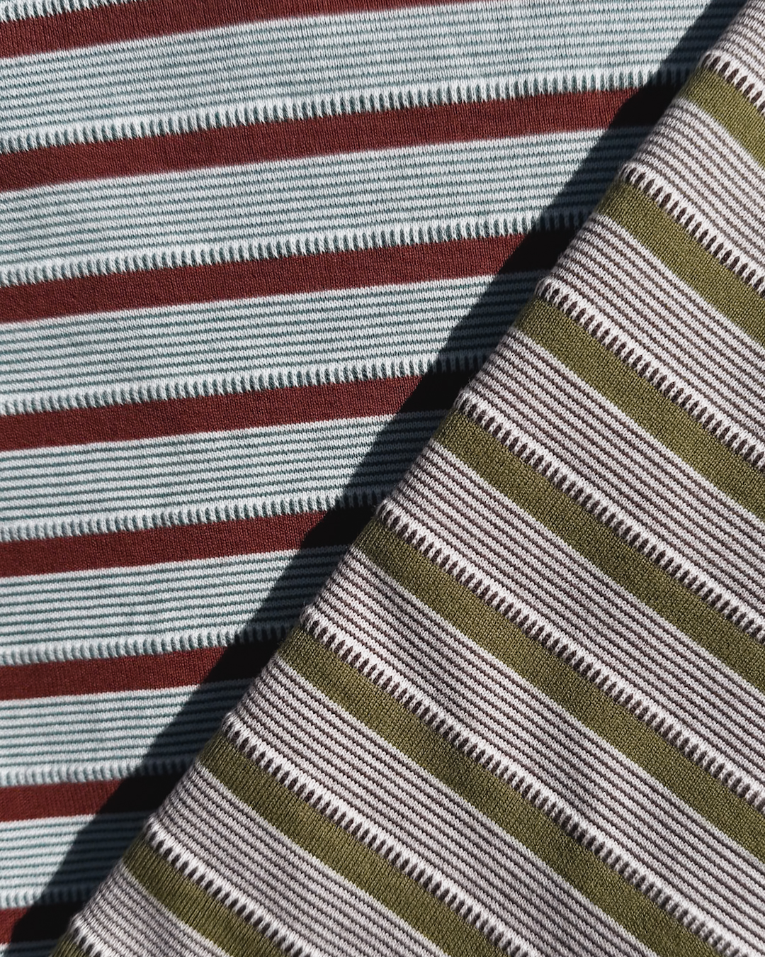 ベースのカットソーを編み立てた上からを縦線部分をジャガードで加工している凹凸ある生地