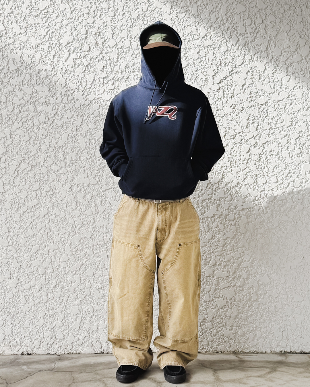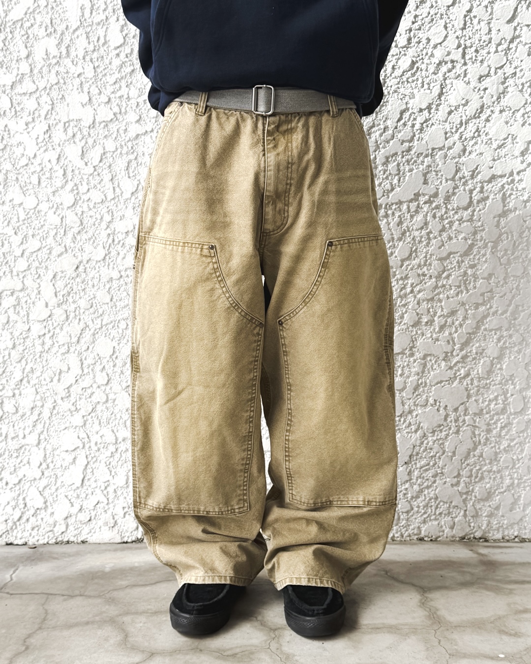 ダブルニーでは意外と少ない裾までズドンと落ちるワイドなシルエット。太めではありますが、やり過ぎていない、ずっと使えるシルエットだと思います